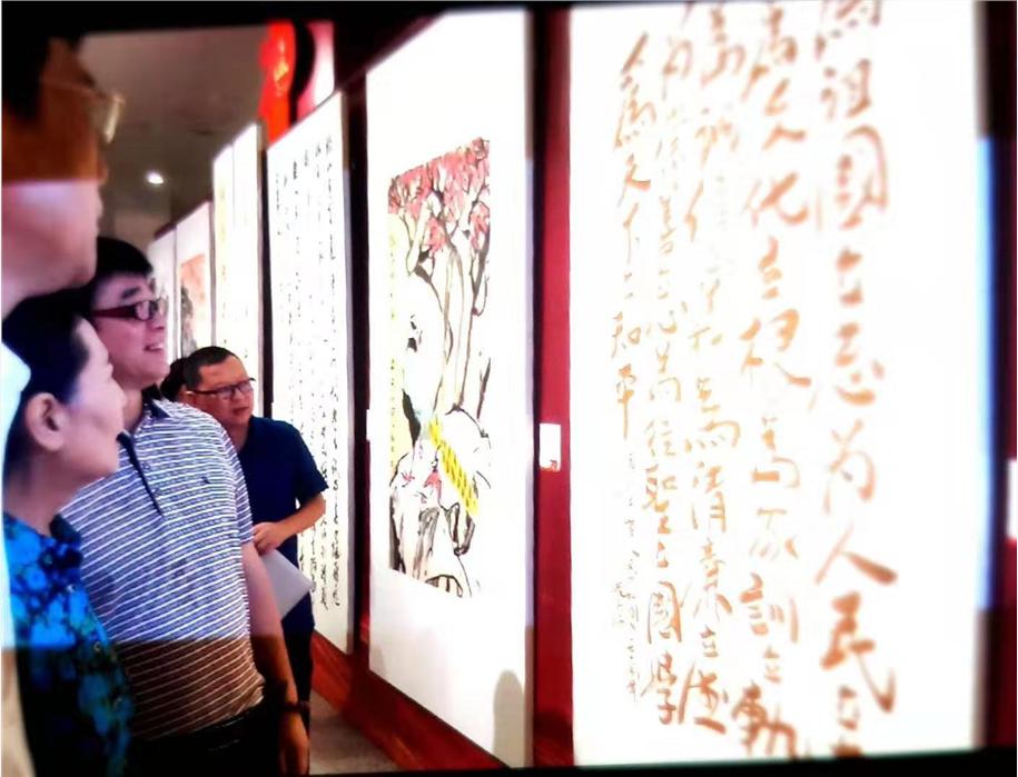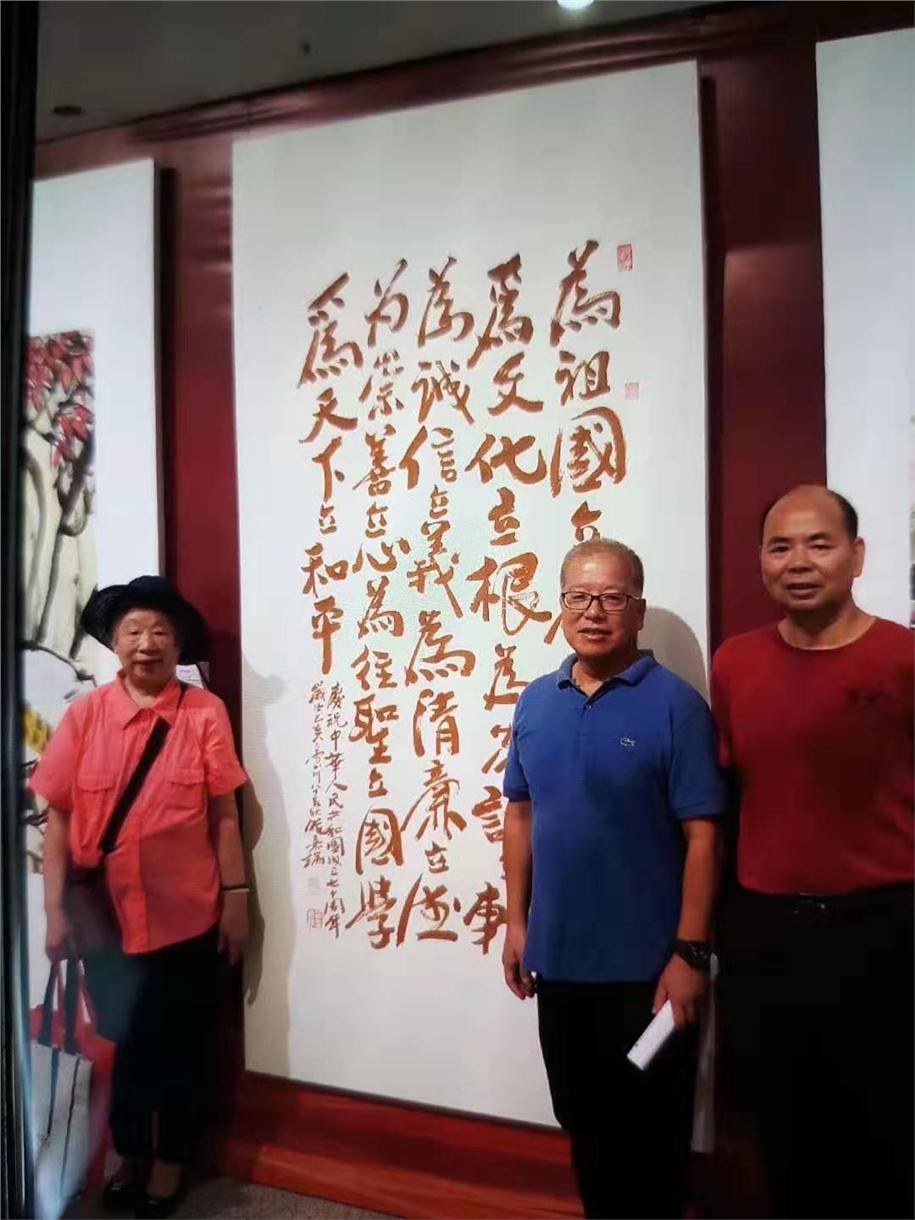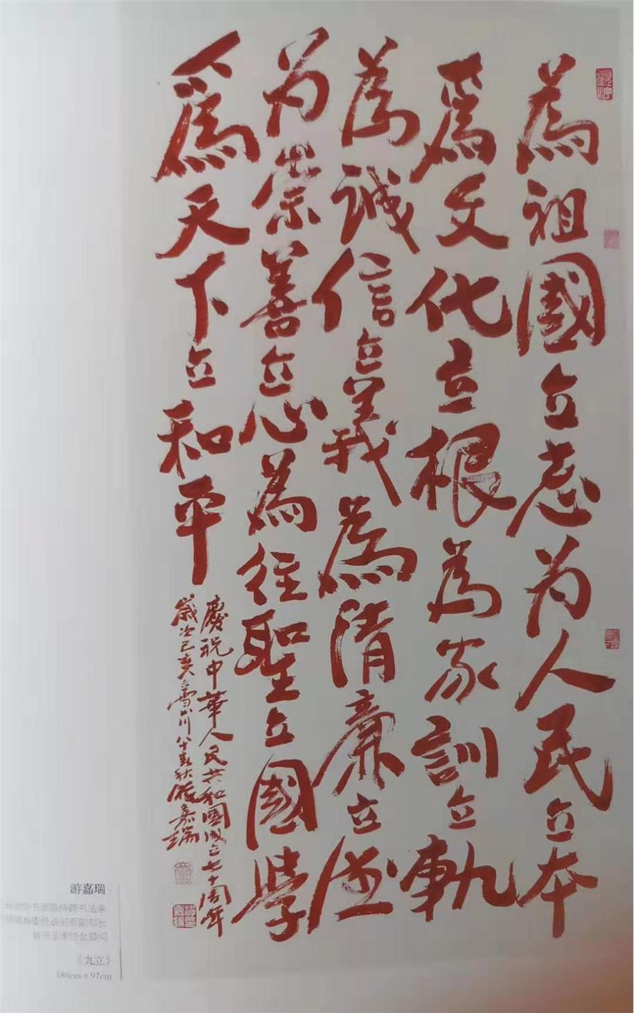 游嘉瑞应邀书《九立》,参加福建省政协举办的70周年国庆书画展,领導观众注目。展品收录《致敬祖国》画册。