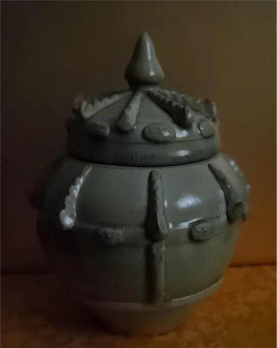 东汉越窑秘色瓷绳索纹盖罐