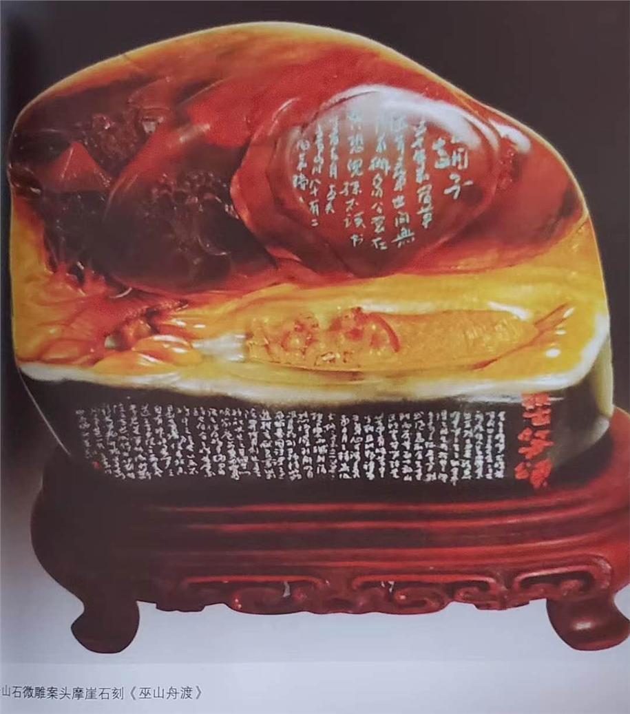 苦笋先生游嘉瑞独創寿山石微雕案头摩崖石刻作品:山川巫山舟渡,寿山石三秀园,题刻苦笋颂等
