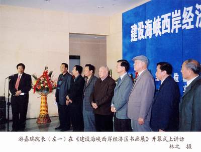 新华社福州12月1日电(林之)福建省首次以书画形式宣传贯彻中共福建省委关于“建设海峡西岸经济区”发展战略的书画展,12月1日至3日在福建省美术馆举行。开幕当天有数百人前往参观。 省领导黄文麟、王直、卢福祥、陈增光等出席开幕式。海峡书画研究院院长、省书法家协会副主席游嘉瑞,在开幕式的讲话中说:建设海峡西岸经济区的号角,已响遍八闽大地的山山水水。与时俱进的海峡书画研究院与全省书画家、美术工作者一道扛起如椽大笔,为建设大潮鼓与呼。他们用浓墨泼写党的十六届四中全会精神;他们用重彩绘画海峡西岸经济区建设的蓝图;他们吟诵改革开放的巨大成就;他们歌唱祖国青山绿水的好风光……唤起全省人民经济建设的激情,唤起人们对美好生活的渴望,共同发展美好的未来。这就是今天书画展的愿望与祝愿,与建设大军共勉! 由海峡书画研究院、福建省美术馆、立雪书院联合举办的这次书画展,共展出了百余幅书画作品,省、市老领导游德馨、黄文麟、宋峻、赴守箴等为书画展题词。研究院老、中、青书画家,都以自己精心创作的书画作品,为加快福建经济发展,提高我国东南沿海整体经济实力,为祖国的完全统一大业贡献自己的力量。 书画作品中,引人注目的有中共福建省委统战部主持工作的原副部长、海峡书画研究院院长游嘉瑞,书写自己受到读者称赞的散文代表作《石竹叙》8条屏,以物喻人,意为廉政,神采飞扬,书、文俱佳,品位高雅。 我国著名老画家郑乃珖的《柳荫深处》,是此次画展部分的“重头戏”