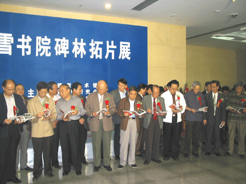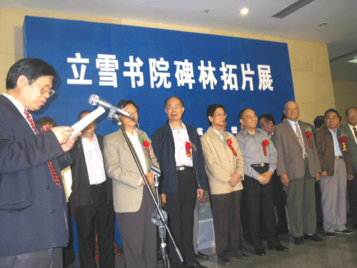 由福建省美术馆、福建省游酢研究会、海峡书画研究院、立雪书院举办的《立雪书院碑林拓片展暨山川文集题刻篇首发式》4月23日在省美术馆隆重举行。省委副书记、省政协副主席黄瑞霖,原省人大副主任王一士、黄文麟、宋峻,原省军区司令员卢福祥,原省政协副主席陈荣春、叶庆耀等领导,以及艺术家、学者、专家、企业家各界人士500余人参加了开幕式。200余件别具一格的碑刻拓片展,被誉为“流动的碑林”。 立雪书院是由著名书法家游嘉瑞于2002年创办,次年建立《立雪碑林》,两处景点,被合称为国家重点名胜风景区、国家AAAA级旅游区,青云山人文第一景。二者冠名《立雪》意在旌表宋代理学家、教育家、书法家游酢与杨时“程门立雪”尊师重教的风范;旨在兴风读书,见贤思齐,弘扬中华民族优秀文化。 碑林拓片展有三大内容:领导题词单元,有华国锋、陆定一、杨成武、王兆国、陈丕显、方毅、钱昌照、萧克、廖汉生等15位领导的题词;二、“程门立雪”系列,有“程门立雪”成语典故、《立雪书院宣言》、《立雪书院记》、《立雪书院志》、《立雪赋》、《道南正脉》、《师道》、游酢《诲子颂》、《寄友杨中立二首》等。值得一提的是游酢自草诗作《晃友杨中立二首》,是一幅长3米、高0.8米的诗碑拓片,人们可以一睹宋代五大草圣之一游酢“飞剑惊心”的神笔风采。而《立雪书院记》则是著名书法家赵玉林先生楷书作品,同样令人称绝。三、全国文联审定“99中国百杰书法家”墨宝。书体俱全,异彩纷呈,美不胜收。“99中国百杰”之一游嘉瑞先生的散文代表作---《苦笋颂》、《石竹叙》、《梅花说》、《榕树赞》碑刻拓片以及“让人非我弱,得志莫逞强”、“众士一心,振兴中华”等篆刻拓片,也格外赏心悦目。 此展件件拓片作品,以独特的墨香,给一批又一批的参观者以美的享受。福建省书法家协会副主席,立雪书院院长游嘉瑞说“立雪书院意为积学储宝、止于至善,这次拓片展旨在弘扬文化,启迪后人”。