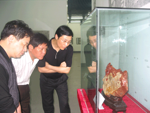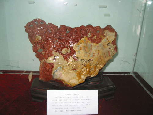 红白相间重达到18公斤的寿山石,红的部分雕九龙,意为龙的传人。白的部分雕中国地图,并以树林衬托,由著名书法家、寿山石微雕《案头摩崖石刻》创始人游嘉瑞刻了祖国颂、游长城、南国行、西南行、西北行、敦煌行、游布拉宫、归里作等12首诗。熔诗文、书法、篆刻、雕刻、赏石为一炉的圆雕艺术与《案头摩崖石刻》相结合的作品,人见人爱。