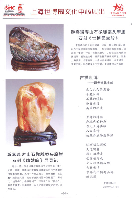 游嘉瑞寿山石微雕案头摩崖石刻《世博元宝船》